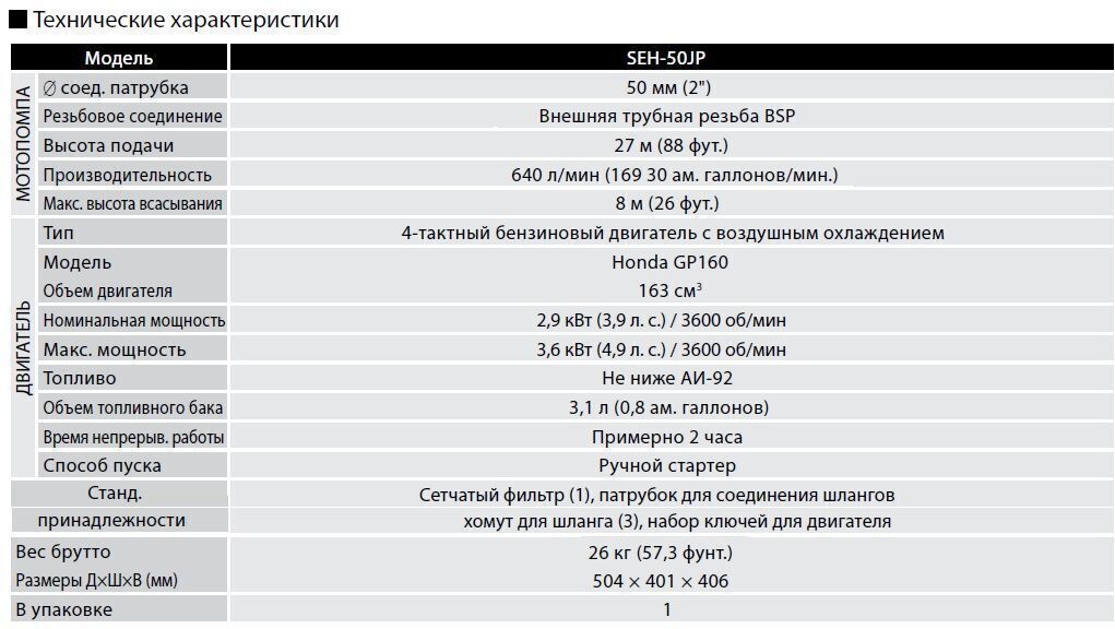 Бензиновая мотопомпа, для слабозагрязненной воды (откачка речной воды, колодца, затопленного подвала и дачного участка) Мощность, 3.9 лс, Производительность 38.4 куб м/час, напор 27 м, двигатель Honda GP160, D вх/вых 50 мм, размер частиц 6 мм, бак 3.1 л.