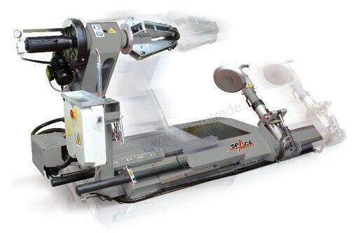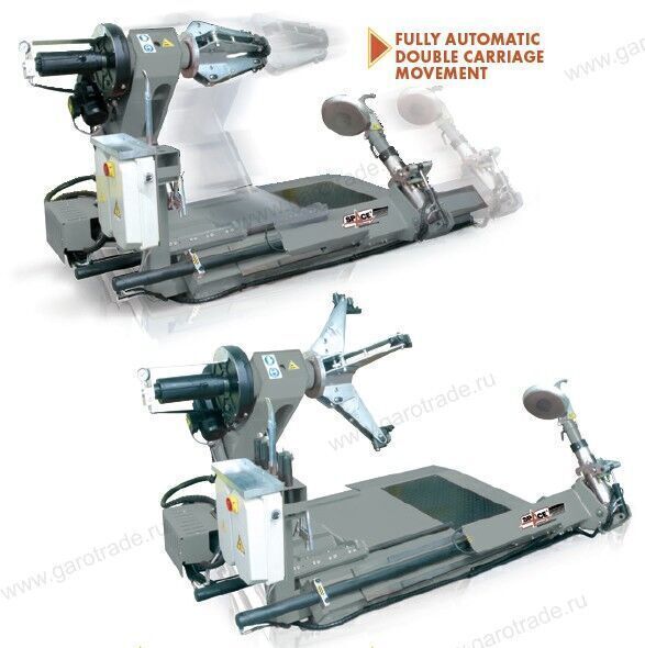 Две каретки с гидравлическим приводом перемещения. Особенностью данной модели является то, что и рабочий инструмент, и зажимное устройство установлены на подвижных каретках, имеющих привод и возможность перемещения по горизонтали. Это существенно ускоряет процесс работы, особенно с широкими шинами.